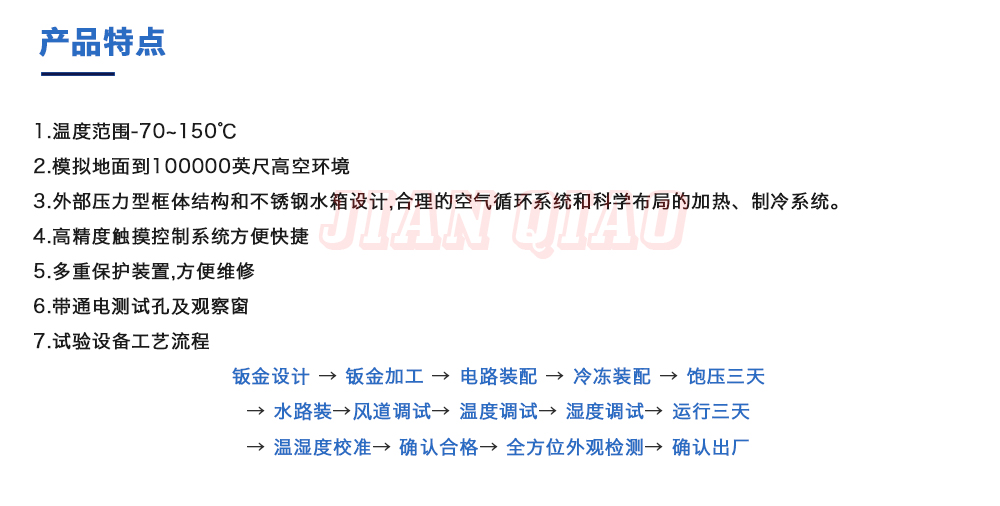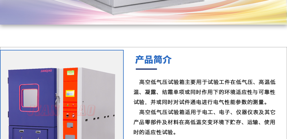 用途:高低溫低氣壓試驗箱主要用于試驗工件在低氣壓、高溫低溫單項或同時作用下的環(huán)境適應性與可靠性試驗,并或同時對試件通電進行電氣性能參數(shù)的測量。