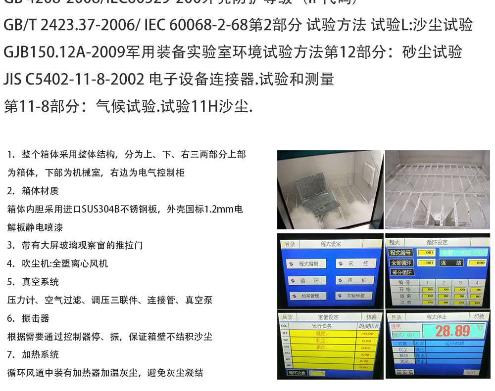 用途:防塵試驗箱適用于防護等級 (IP code), GB/T 4942.2-93(低壓設(shè)備防護等級),GB 7000.1(燈具防護等級),DIN40050和IP5K0等校準(zhǔn)設(shè)計制造。SC-015應(yīng)用于LED燈具和其它照明產(chǎn)品對IP5X和IP6X防塵等級測試。