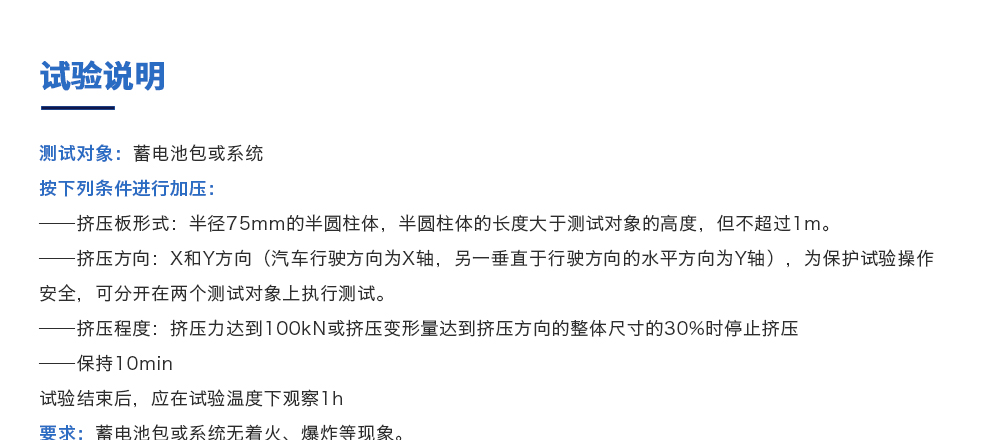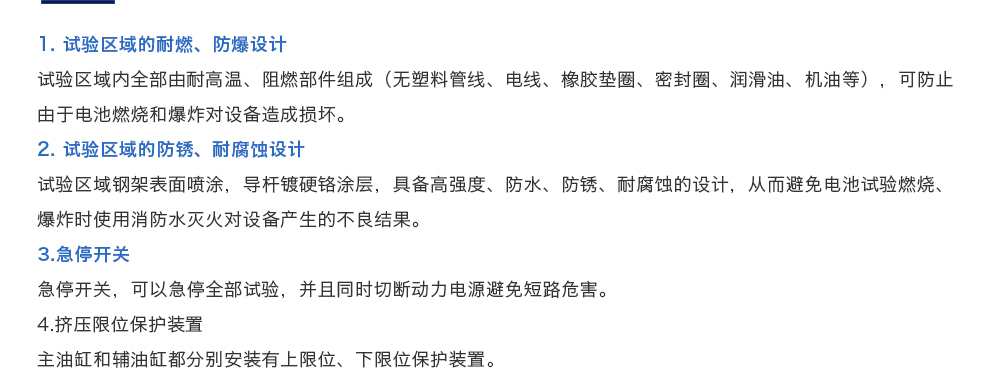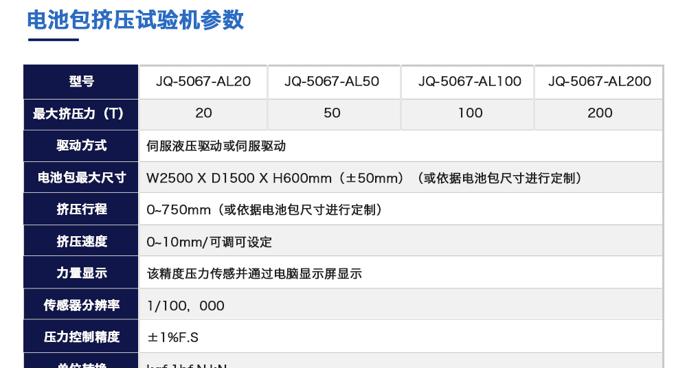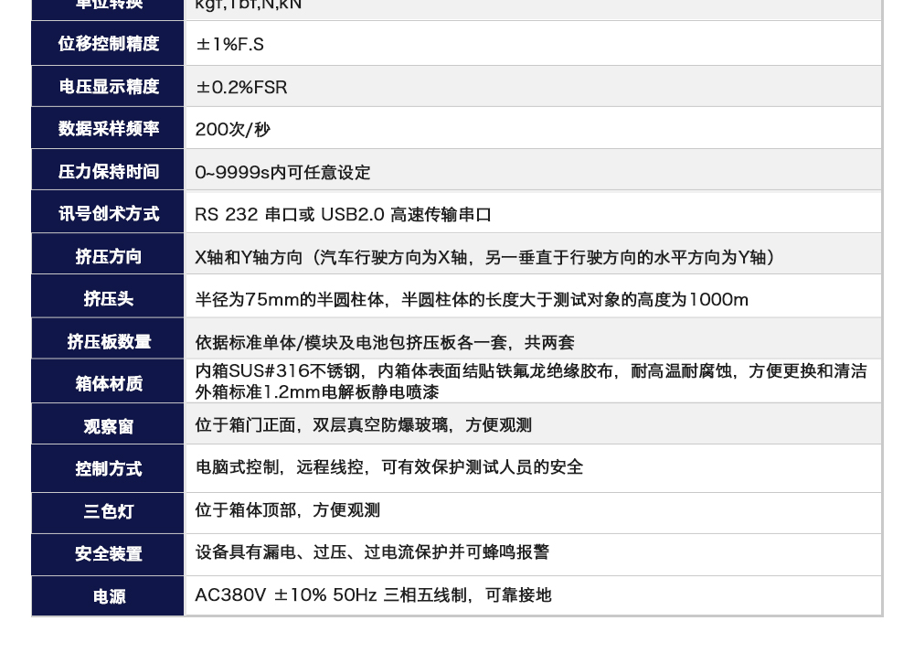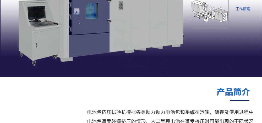 用途:電池包擠壓試驗機模擬各類動力動力電池包和系統(tǒng)在運輸、儲存及使用過程中電池包遭受碰撞擠壓的情形,人工呈現(xiàn)電池在遭受擠壓時可能出現(xiàn)的不同狀況。