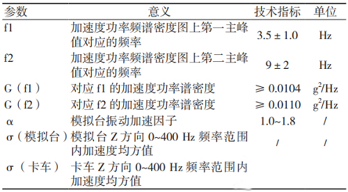 模擬運(yùn)輸臺的設(shè)計(jì)參數(shù)主要依據(jù)《QJ/T 815.2-94產(chǎn)品公路運(yùn)輸加速模擬試驗(yàn)方法》[3]設(shè)定。該標(biāo)準(zhǔn)中規(guī)定了模擬運(yùn)輸臺的關(guān)鍵技術(shù)指標(biāo),見表1。